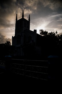 I was in a bit of a hurry, but I snapped a few, then jumped back in the car and headed to work.  There was some nice clouds behind the church from one angle, and kept remembering this as I downloaded the images to process, I knew that my attitude toward the shot was less than optimal and I had deliberately exposed for the building and not the skies (since it was just for the press), as the sun was rising behind the church, all that detail would be blown out.